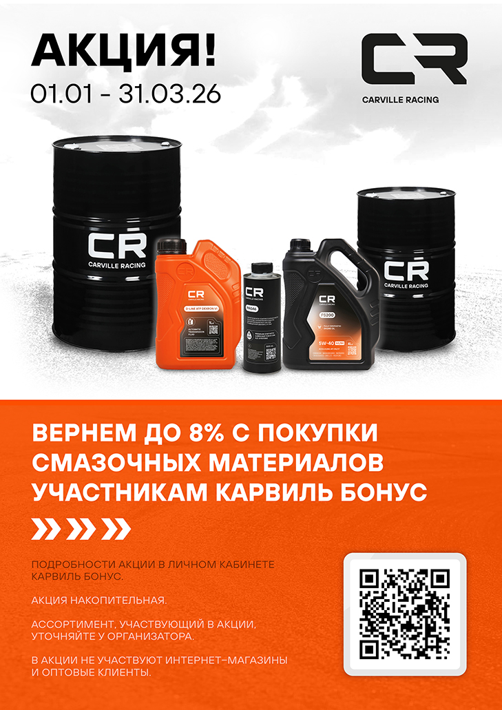01.01 - 31.03.2026 Акция ПЛ Карвиль Бонус "Вернем до 8% с покупки смазочных материалов CARVILLE RACING участникам Карвиль Бонус"